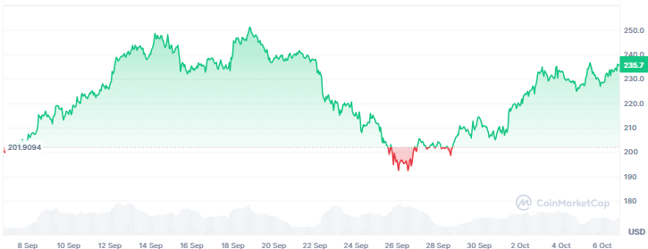 Für Solana geht es in den letzten Tagen deutlich aufwärts, um genauer zu sein um mehr als 17 Prozent in nur sieben Tagen. Direkt daran schließt sich ein positive Entwicklung von 11 Prozent innerhalb von einem Monat an, Tendenz stark steigend. Damit steht der Altcoin erneut kurz rund um den Support von 230 US-Dollar und könnte in den nächsten Tagen bereits 250 US-Dollar durchbrechen. Einer der stärksten Kurstreiber in diesem Zusammenhang ist die Spekulation rund um eine mögliche Genehmigung eines ersten Spot-ETFs auf der Basis von Solana in den USA. Sollte es tatsächlich zeitnah zu einer Auflage kommen, ist stark davon auszugehen, dass es stark für den Altcoin in Richtung Norden gehen wird.
