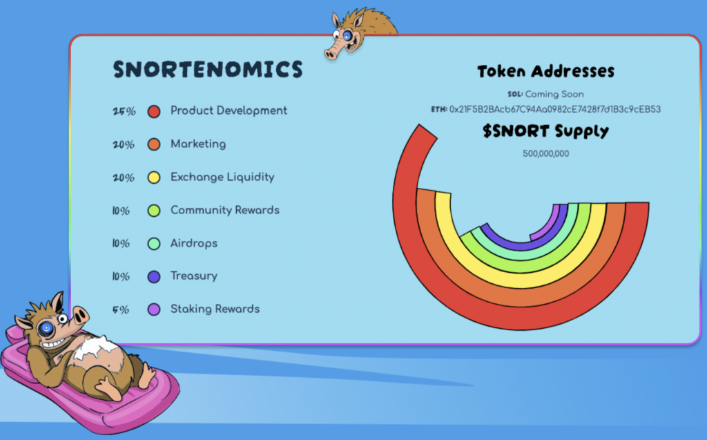 Im Zentrum des Projektes steht der Nativetoken mit dem Namen $SNORTER, der im Zusammenhang mit dem Vorverkauf erworben werden kann. Damit ein derartiges Projekt zum Erfolg wird, reicht es jedoch nicht aus, ausschließlich ein innovatives Angebot anzubieten. Auf der anderen Seite bedarf es ebenso eines durchdachten Einsatzes der zur Verfügung stehenden Tokens durch das Projektteam. Der Großteil der Tokens, um genauer zu sein 25 Prozent, fließt in die Projektentwicklung und damit in das Herzstück des Projektes. Weitere 20 Prozent sind für das Marketing vorgesehen, um das Projekt auch über die Grenzen der Kryptoszene hinaus bekannt zu machen. Darüber hinaus sind weitere 20 Prozent für das initiale Börsenlisting angedacht, neben 10 Prozent für Prämien an die Community, 10 Prozent für Airdrops, 10 Prozent für die allgemeine Liquidität und die restlichen 5 Prozent für das Staking.