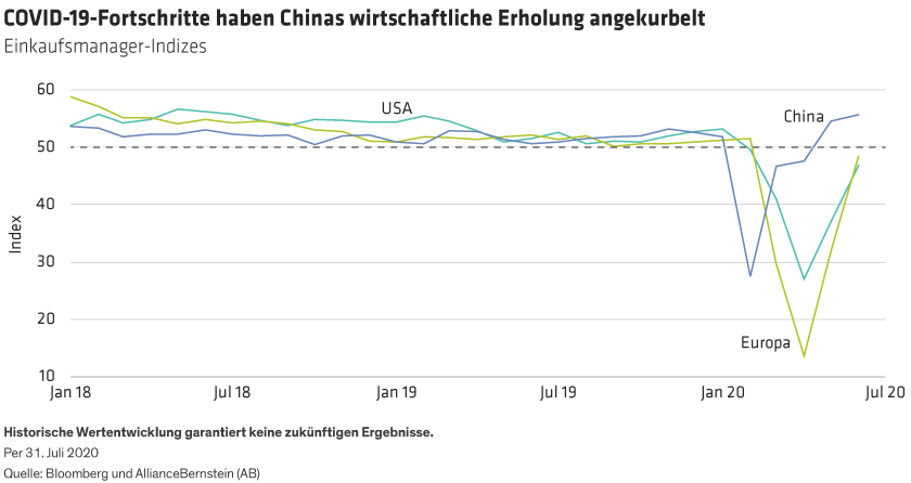 1) Stabilisierung der Konjunktur führte zu Rotation in Aktien. China hat sich schneller als andere Regionen vom Lockdown erholt und konnte bis heute eine zweite Welle weitgehend vermeiden. Davon profitierte auch die Konjunktur (Abbildung).