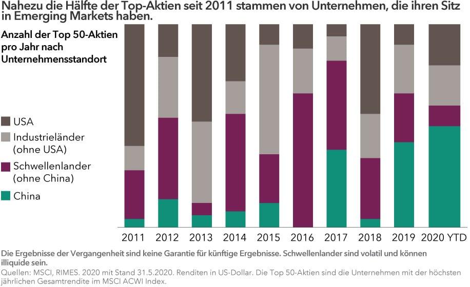 In den letzten 10 Jahren machten Aktien aus Schwellenländern 49 % der 50 größten Aktien im MSCI ACWI aus. Über fünf Jahre betrachtet erhöht sich diese Zahl auf 62 %. Während also die entwickelten Märkte auf vermögensgewichteter Basis höhere Renditen erzielt haben mögen, haben sich die Schwellenländer auf Basis der einzelnen Unternehmen als profitabler erwiesen.