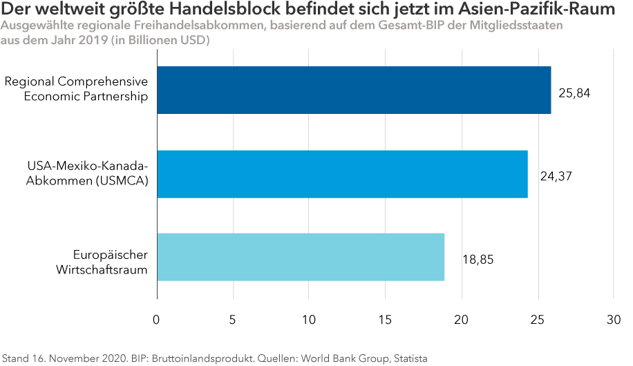 Dennoch bleibt der Welthandel auf dem Pfad von Wachstum und Entwicklung. Im November 2020 unterzeichneten 15 Länder aus dem Asien-Pazifikraum das Regional Comprehensive Economic Partnership (RCEP)-Abkommen. Zu diesen gehören die 10 ASEAN-Mitglieder1 sowie China, Japan, Südkorea, Australien und Neuseeland.