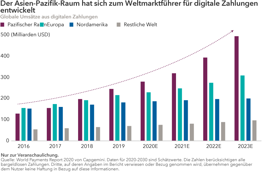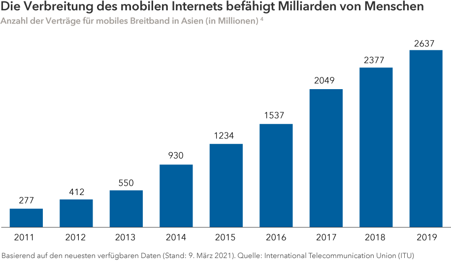Die Asien-Pazifik-Region wird im Jahr 2020 voraussichtlich über 60 % des weltweiten Umsatzes im Online-Einzelhandel erzielen, mehr als dreimal so viel wie die USA.5 Obwohl der Onlinehandel in einigen asiatischen Ländern eine höhere Durchdringung aufweist als in den USA und in Europa, ist der gesamte adressierbare Markt aufgrund der größeren und wachsenden Bevölkerung Asiens weitaus größer.