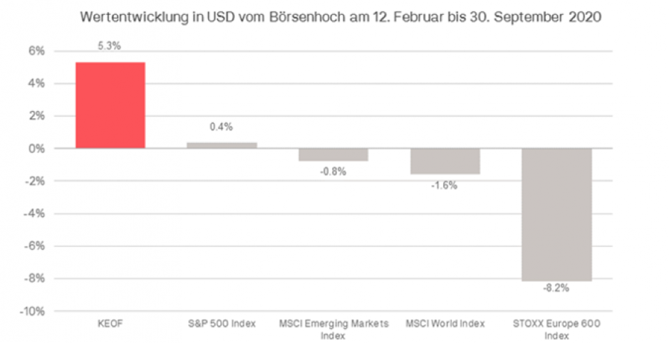 Die weltweiten Aktienmärkte befanden sich im September im Rückwärtsgang. Steigende Infektionszahlen in Europa und Amerika sowie die politische Unsicherheit um die US-Präsidentschaftswahlen belasteten die Stimmung an den Märkten. Der MSCI Weltaktienindex verlor im Berichtsmonat 3,5%, der KEOF verzeichnete einen Rückgang von 3,3%. Damit notierte der KEOF per Ende September 5,3% über den weltweiten Börsenhochs vom 12. Februar diesen Jahres, während die bekannten Aktienindices seither eine Wertentwicklung zwischen +0.4% und -8,2% verzeichnen.