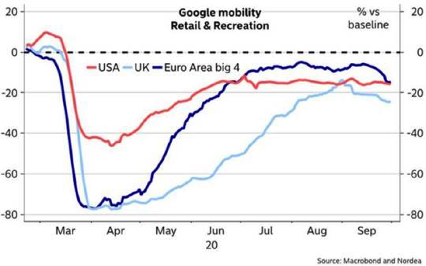 Hochfrequenzdaten wie Retail-Umsätze, Restaurantreservierungen und Mobilitätsindikatoren erreichten in den USA und Europa Ende März / Anfang April den Tiefpunkt (siehe Grafik unten) und damit ziemlich genau mit den Tiefs an den Börsen. Die seither stattfindende Erholung hat im August ihren Höhepunkt erreicht. Die Hochfrequenzdaten zeigen seither eine rückläufige Entwicklung, was die eingangs beschriebene Entwicklung einer Wachstumsverlangsamung bestätigt.