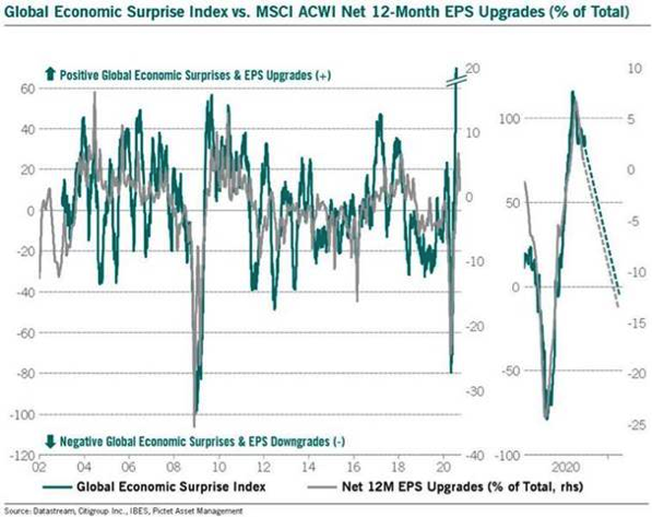 In die gleiche Richtung deutet der sogenannte „Global Economic Surpise Index“, der steigende respektive fallende wirtschaftliche Überraschungen misst (grüner Chart in Grafik unten). Der Höhepunkt der globalen Wirtschaftsdynamik wurde bereits erreicht und für die kommenden 3 bis 6 Monate muss mit negativen wirtschaftlichen Überraschungen gerechnet werden. Da der Global Economic Surpise Index in aller Regel mit den Gewinnerwartungen korreliert ist (grüner Chart in Grafik unten), dürften Herabstufungen bei den Gewinnschätzungen die Folge sein, womit den Märkten eine Enttäuschung droht.
