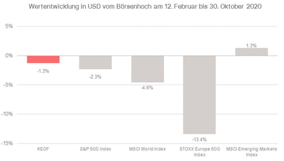 Die weltweiten Aktienmärkte setzten ihre Korrektur auch im Oktober fort. Unmittelbarer Auslöser waren die wieder stark steigenden COVID-19-Fallzahlen in Europa und den USA und die von vielen Regierungen beschlossenen härteren Maßnahmen gegen die Ausbreitung des Virus. Mit Ausnahme der Schwellenländer (v.a. China), die von erneuten, größeren COVID-19-Anstiegen mehrheitlich verschont geblieben sind, konnte sich kein Handelsplatz dem Abwärtssog entziehen. Der globale Aktienindex verlor im Berichtsmonat 3,1%, während der KEOF um 6,3% zurückging.