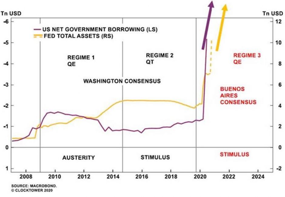 In den vergangenen fünfzehn Jahren wurde entweder in größerem Masse über die Geldpolitik stimuliert oder aber via Fiskalpolitik (siehe Abbildung unten). Spätestens mit dem Ausbruch der Corona-Krise hat aber ein Sinneswandel bei den Politikern eingesetzt. Der «Washington Consensus» ist dem „Buenos Aires Consensus“ gewichen, d.h. jegliche Bedenken über den Schuldenstand wurden über Bord geworfen. Die US-Notenbank sieht die Zinssätze für die absehbare Zukunft bei Null und ist der Meinung, dass wir mit einer höheren Inflation gut zurechtkommen werden. Fiskalische Konjunkturprogramme sind somit der Dreh- und Angelpunkt geworden und die Aushöhlung der Unabhängigkeit der Zentralbank wird zunehmend hingenommen. Daher wird ein neuer Wirtschaftszyklus beginnen, in dem das Wachstum dank der Fiskalpolitik überraschend positiv ausfallen wird.
