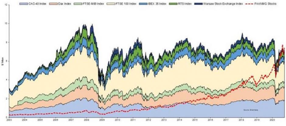 Vor diesem Hintergrund ist es wahrscheinlicher, dass 2021 ein Jahr der starken globalen Erholung sein wird, als eine Verlängerung des Corona-Abschwungs. Nach den US-Präsidentschaftswahlen wird ziemlich klar werden, dass wir es nicht mehr mit einer Austeritätspolitik zu tun haben werden, wie das zwischen 2010 und 2016 der Fall war. Somit dürfte auch die Zuflucht in die vermeintlichen „COVID-Gewinner“ im Technologiebereich abebben und „Big Tech“ auf relativer Basis den Höhepunkt bereits erreicht haben. Der Anteil der sechs Big-Tech-Aktien „FAANMG“ (Facebook, Amazon, Apple, Netflix, Microsoft, Google) an der Marktkapitalisierung des S&P500 stieg von 18% Anfang 2020 auf einen Höchststand von 26.2% am 1. September und liegt nun bei rund 25%. Damit übertrifft die Marktkapitalisierung der FAANMG-Aktien jetzt jene der 7 größten europäischen Länder (Vereinigtes Königreich, Deutschland, Frankreich, Italien, Spanien, Russland und Polen), siehe Abbildung unten. Mit einer Normalisierung würde nicht nur die Dominanz der Big-Tech-Titel enden, sondern vermutlich auch die Vorherrschaft der US-Börsen.