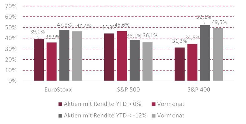 Die überwiegende Mehrheit der Unternehmen, welche eine negative Rendite aufweisen, rentieren sogar (weiterhin) im Bereich von -12% und mehr (dunkelgrau). Sowohl im Euro Stoxx als auch im S&P 400 sind dies um die 50% aller Aktien. Auch der S&P 500 weist ebenfalls ca. 38% der Aktien aus.
