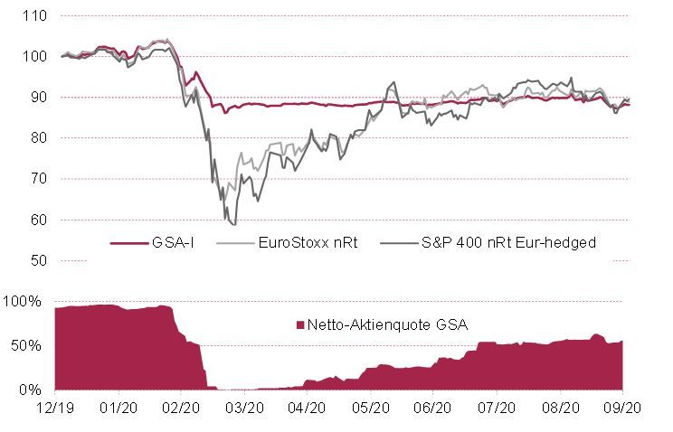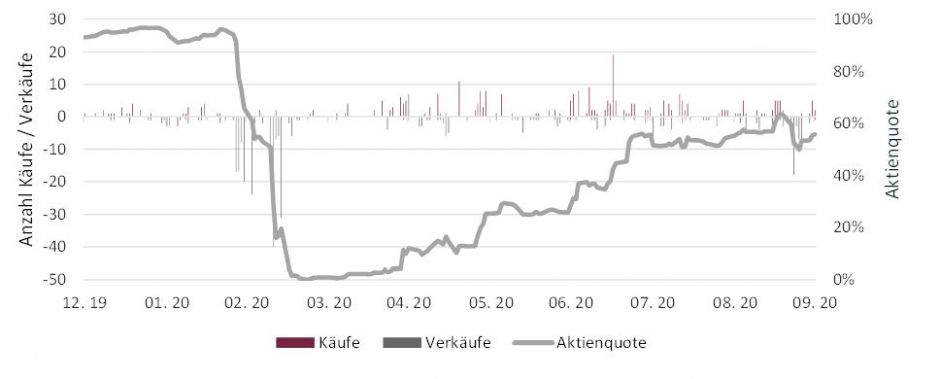 Abbildung 4 zeigt, wie sich die Aktienquote im Fonds von 95% auf 0% absenkte und sukzessive während der Corona-Pandemie wieder erhöht wurde. Die vertikalen Balken markieren die Anzahl verkaufter (Balken nach unten) und gekaufter (Balken nach oben) Aktienpositionen. Im Monat September stieg die Aktienquote zunächst auf über 60% an, wurde dann aber durch vermehrte Verkäufe wieder auf ca. 56% abgesenkt.