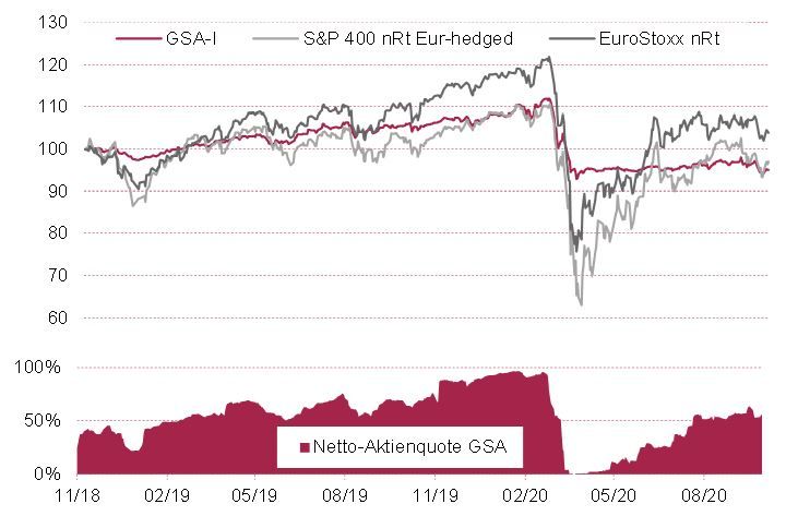 In Abbildung 6 ist die Entwicklung des Fonds seit Auflage zu sehen. Das Ziel des Fonds ist es, langfristig eine aktienmarktähnliche Rendite bei reduzierten Verlustphasen zu erzielen. Dabei wird in Hausse-Phasen eine erhöhte und in Baisse-Phasen eine niedrige Aktienquote angestrebt. In der Kürze der Zeit bewies der Fonds bereits, dass er beides mit der zugrundeliegenden Allokations-Systematik erreichen kann.