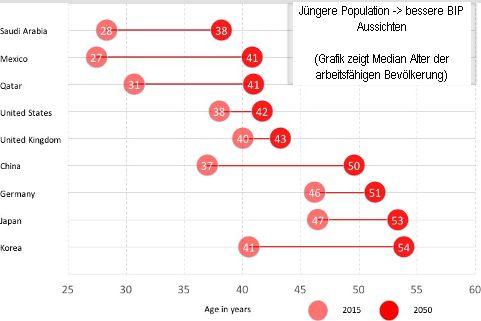 Damit gerät die Demographie mehr in den Fokus: Staaten mit einer wachsenden und jungen arbeitenden Bevölkerung sollten auch langfristig in der Lage sein, ihre Schulden zu begleichen, sprich, die ausgegebenen Anleihen zurückzuzahlen. Die nachstehende Grafik 1 zeigt wie groß die Altersunterschiede in ausgewählten Ländern sind.