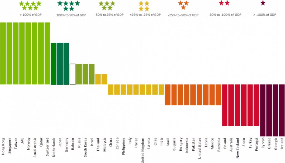 Dazu gehört die Nettoauslandsverschuldung der Länder, also die Vermögenspositionen, die das Land im Ausland besitzt abzüglich der Vermögen von Ausländern im Inland. Länder, die per saldo zu den Gläubigerländern gehören, werden besser in der Lage sein, ihre Schulden in Form von Anleihen zu begleichen.