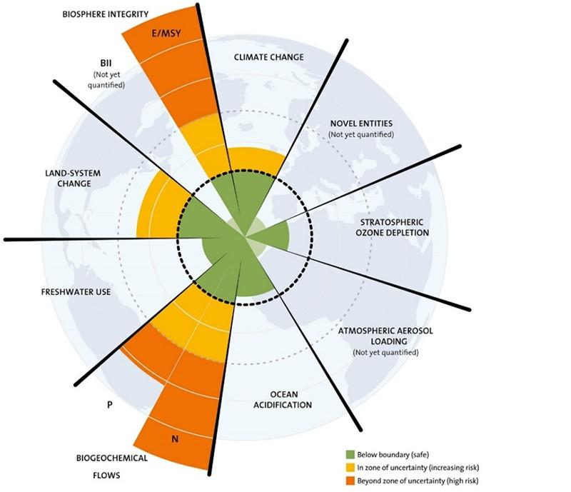 Abbildung 1 zeigt, in welchem Zustand sich die Erde nach den Forschungsergebnissen des SRC befindet. Sie zeigt auch, dass die anhand der Aussterberate (ausgestorbene Arten pro einer Million Arten und pro Jahr) gemessene Unversehrtheit von Biosphären hochgradig gefährdet ist und die Belastungsgrenze bereits überschritten wurde. Da auch bei den biogeochemischen Kreisläufen (Stickstoff und Phosphor) die Grenzen überschritten wurden, wissen wir nicht, wie die Ökosysteme reagieren werden.