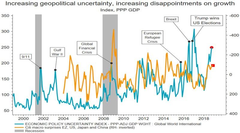 „Dazu gehören die Handelskonflikte zwischen China und den USA, negative Überraschungen beim Wirtschaftswachstum, der Übergang der Fed zu einer eher neutralen Geldpolitik, die Konfrontation zwischen der EU und Italien über den Haushalt des Landes, der Eintritt des Brexit-Verfahrens in eine entscheidende Phase, das Absacken der Ölpreise und die Sorge über eine nachlassende weltweite Gesamtnachfrage.“