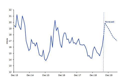 Dies würde unserer Silberprognose für das 3. Quartal 2019 von 19,90 US Dollar pro Unze und der Goldprognose von 1525 US Dollar pro Unze entsprechen. Die Quote dürfte gegen Ende des Prognosehorizonts dann steigen, wenn der Silberpreis Gegenwind spürt.