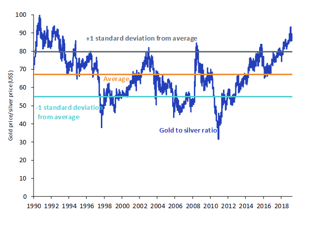 Das Verhältnis von Gold zu Silber hatte im Juli 2019 den höchsten Stand seit 1993 erreicht, Silber war im Vergleich zu Gold sehr günstig. Diese Quote ist in den vergangenen Wochen geringfügig gesunken, der Silberpreis beginnt sich zu erholen. Wir glauben zwar nicht, dass dieses Verhältnis auf seinen historischen Durchschnitt zurückfallen wird, aber man kann durchaus davon ausgehen, dass es auf eine Standardabweichung vom Durchschnitt fallen könnte.