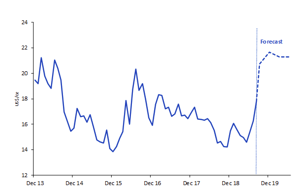 Nach der Aufwärtskorrektur unserer Goldprognose revidieren wir auch unsere Silberpreisprognose für das zweite Quartal 2020 von zuvor 16,5 US Dollar pro Unze auf 17,05 Dollar pro Unze. Allerdings könnte Silber zum Ende des dritten Quartals 2019 mit 19,90 Dollar pro Unze einen deutlich höheren Höchststand erreichen. Taktisch sehen wir daher in naher Zukunft eine starke Gelegenheit für ein Investment in Silber. Gemäß dem in unserer letzten Silberprognose beschriebenen Ansatz überführen wir unser neues Basismodel für Gold in ein Modell für Silber.