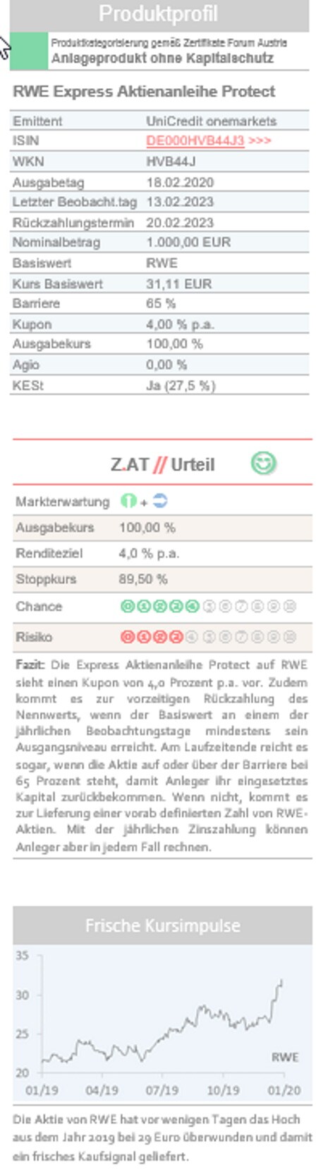An der Börse kamen die Nachrichten gut an. Mit dem Sprung über 29 Euro hat die RWE-Aktie ihr 2019er-Hoch geknackt. Angesichts dessen könnte eine neue Express Aktienanleihe Protect von UniCredit onemarkets interessant sein (ISIN DE000HVB44J3). Das Papier ist mit einem Kupon von 4,0 Prozent p.a. ausgestattet, der unabhängig von der Kursentwicklung der RWE-Aktie an den jährlichen Beobachtungstagen gezahlt wird. Daneben besteht die Chance auf Rückzahlung zum Nennwert, erstmals nach einem Jahr. Dazu muss der Basiswert mindestens 100 Prozent des Ausgangsniveaus erreichen. Andernfalls geht es in die Verlängerung.